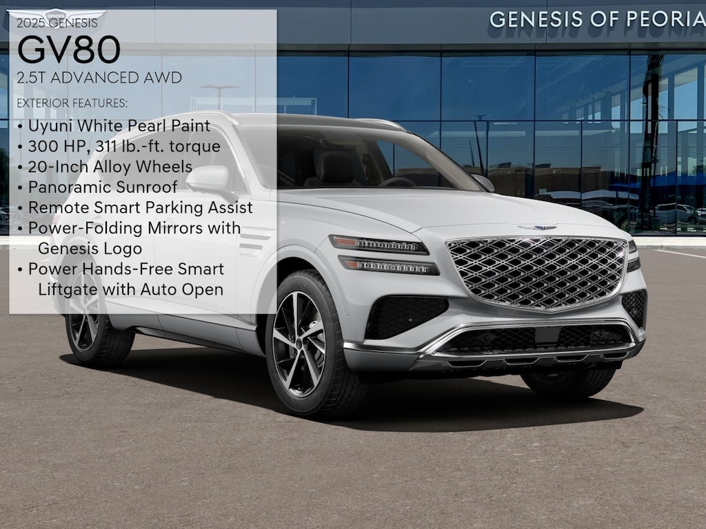 This 2025 Uyuni White Genesis GV80 2.5T Advanced AWD is well equipped and includes these features and benefits: Option Group 01, 18 Speakers, 4-Wheel Disc Brakes, ABS brakes, Air Conditioning, All Season Fitted Liners, Alloy wheels, AM/FM radio: SiriusXM, Anti-whiplash front head restraints, Auto High-beam Headlights, Auto tilt-away steering wheel, Auto-dimming door mirrors, Auto-dimming Rear-View mirror, Auto-leveling suspension, Automatic temperature control, Brake assist, Bumpers: body-color, Cargo Blocks, Cargo Net, Cargo Tray, Compass, Delay-off headlights, Driver door bin, Driver vanity mirror, Dual front impact airbags, Dual front side impact airbags, Electronic Stability Control, Emergency communication system: Genesis Connected Services, Exterior Parking Camera Rear, First Aid Kit, Four wheel independent suspension, Fragrance Cartridge, Front & Rear Mudguards, Front anti-roll bar, Front Bucket Seats, Front Center Armrest, Front dual zone A/C, Front reading lights, Fully automatic headlights, Garage door transmitter: HomeLink, Genuine wood console insert, Genuine wood dashboard insert, Genuine wood door panel insert, Heated & Ventilated Front Bucket Seats, Heated door mirrors, Heated front seats, Heated steering wheel, Illuminated entry, Knee airbag, Leather Seating Surfaces, Leather steering wheel, Low tire pressure warning, Memory seat, Navigation System, NFC Key Card, Occupant sensing airbag, Outside temperature display, Overhead airbag, Overhead console, Panic alarm, Passenger door bin, Passenger vanity mirror, Power door mirrors, Power driver seat, Power Liftgate, Power moonroof, Power passenger seat, Power steering, Power windows, Radio data system, Radio: AM/FM/SiriusXM/HD Bang & Olufsen Sound Sys, Rain sensing wipers, Rear air conditioning, Rear anti-roll bar, Rear reading lights, Rear seat center armrest, Rear side impact airbag, Rear window defroster, Rear window wiper, Remote keyless entry, Security system, Speed control, Speed-sensing steering, Speed-Sensitive Wipers, Split folding rear seat, Spoiler, Steering wheel memory, Steering wheel mounted audio controls, Tachometer, Telescoping steering wheel, Tilt steering wheel, Traction control, Trip computer, Turn signal indicator mirrors, Variably intermittent wipers, Ventilated front seats, and Wheels: 20 x 8.5J Dark Gray Matte Alloy. 18 Speakers, 4-Wheel Disc Brakes, ABS brakes, Air Conditioning, All Season Fitted Liners, Alloy wheels, AM/FM radio: SiriusXM, Anti-whiplash front head restraints, Auto High-beam Headlights, Auto tilt-away steering wheel, Auto-dimming door mirrors, Auto-dimming Rear-View mirror, Auto-leveling suspension, Automatic temperature control, Brake assist, Bumpers: body-color, Cargo Blocks, Cargo Net, Cargo Tray, Compass, Delay-off headlights, Driver door bin, Driver vanity mirror, Dual front impact airbags, Dual front side impact airbags, Electronic Stability Control, Emergency communication system: Genesis Connected Services, Exterior Parking Camera Rear, First Aid Kit, Four wheel independent suspension, Fragrance Cartridge, Front & Rear Mudguards, Front anti-roll bar, Front Bucket Seats, Front Center Armrest, Front dual zone A/C, Front reading lights, Fully automatic headlights, Garage door transmitter: HomeLink, Genuine wood console insert, Genuine wood dashboard insert, Genuine wood door panel insert, Heated & Ventilated Front Bucket Seats, Heated door mirrors, Heated front seats, Heated steering wheel, Illuminated entry, Knee airbag, Leather Seating Surfaces, Leather steering wheel, Low tire pressure warning, Memory seat, Navigation System, NFC Key Card, Occupant sensing airbag, Option Group 01, Outside temperature display, Overhead airbag, Overhead console, Panic alarm, Passenger door bin, Passenger vanity mirror, Power door mirrors, Power driver seat, Power Liftgate, Power moonroof, Power passenger seat, Power steering, Power windows, Radio data system, Radio: AM/FM/SiriusXM/HD Bang & Olufsen Sound Sys, Rain sensing wipers, Rear